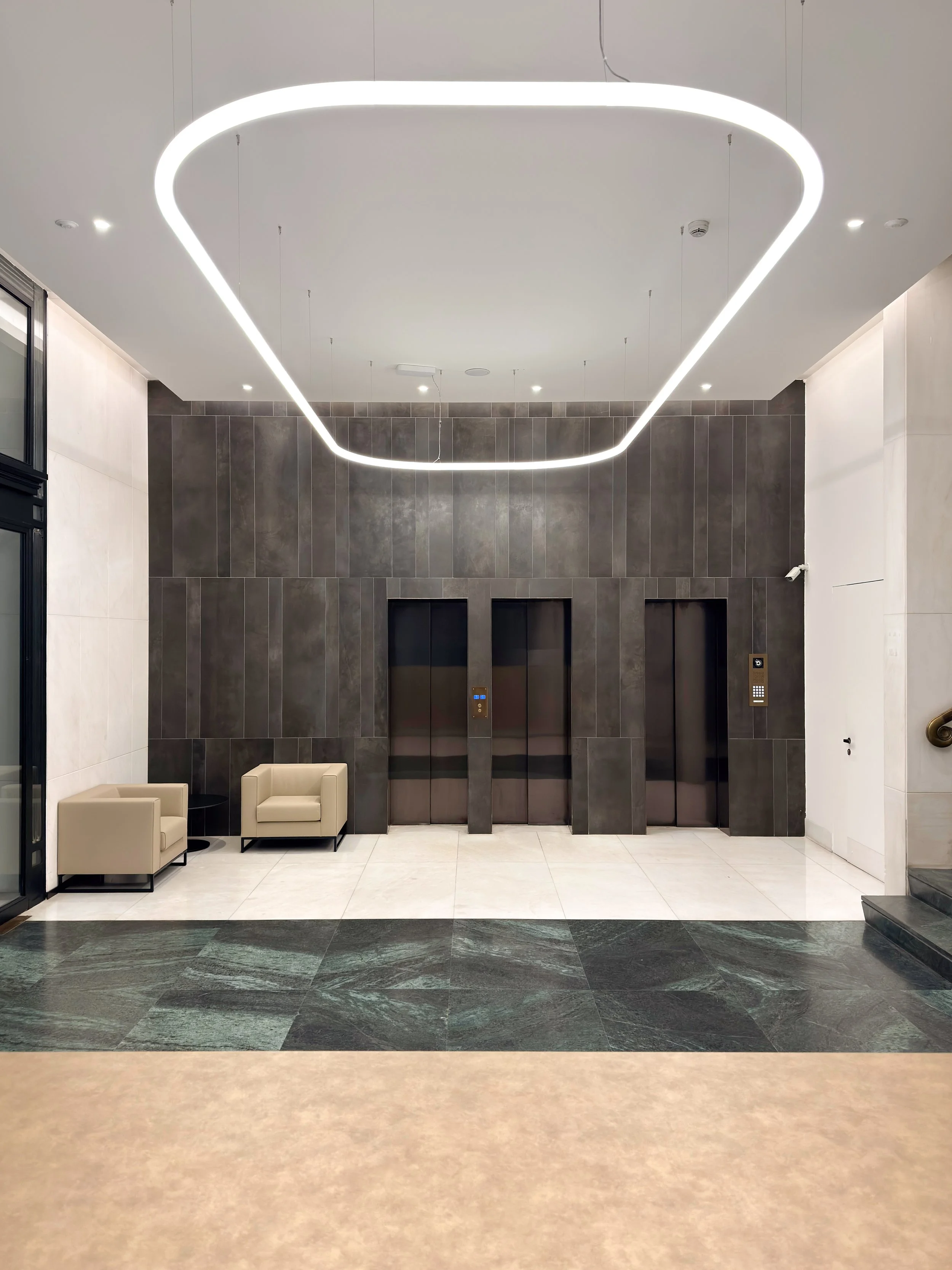 From this perspective, the project developed as a calibrated and timely action, oriented towards the redevelopment of the interior finishes, the relamping of the common areas and facades, and the removal of inconsistent layers that over time had weakened the strength of the original layout.